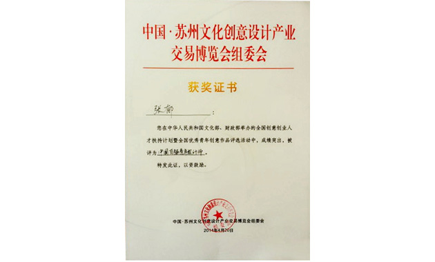 在第三届苏州创博会中,经过国内权威专家和特邀有关企业人士的严格评选,108人被推荐为“2014年全国文化产业创业创意人才扶持计划”的候选人,同时荣获了由本届创博会组委会设立的首届中国青年设计奖之“中国百强青年设计师”;200人荣获“中国优秀青年设计师”。我司执行总裁张郁先生荣获了“中国百强青年设计师”大奖。