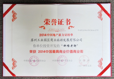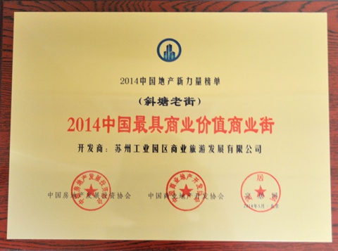 5月18日,在中国房地产开发协会、中国商业地产开发协会、易居网联合主办的“2014中国地产新力量榜单”评选活动中,斜塘老街荣获了“中国最具投资价值商业街”称号。