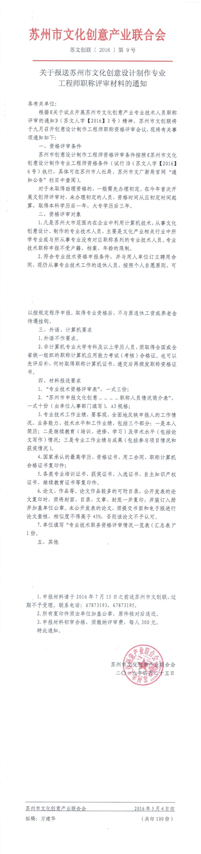 附件下载:1、关于报送苏州市文化创意设计制作专业工程师职称评审材料的通知