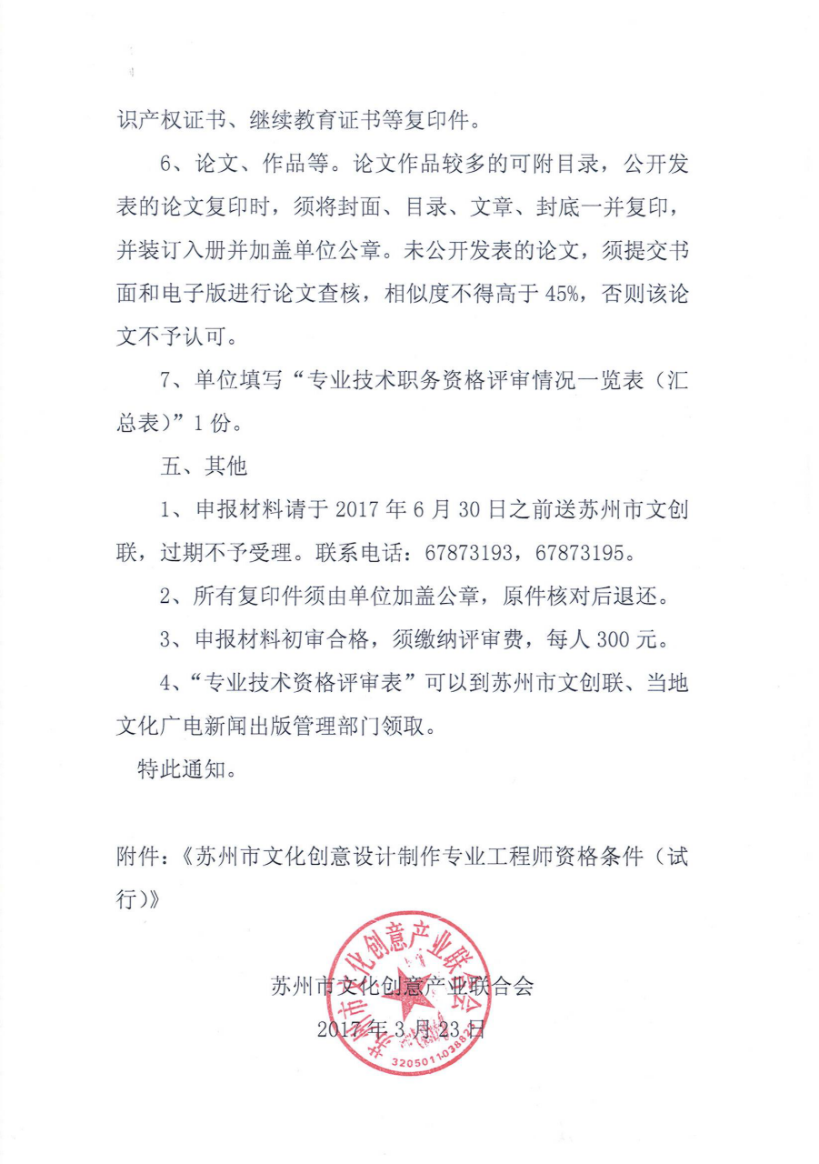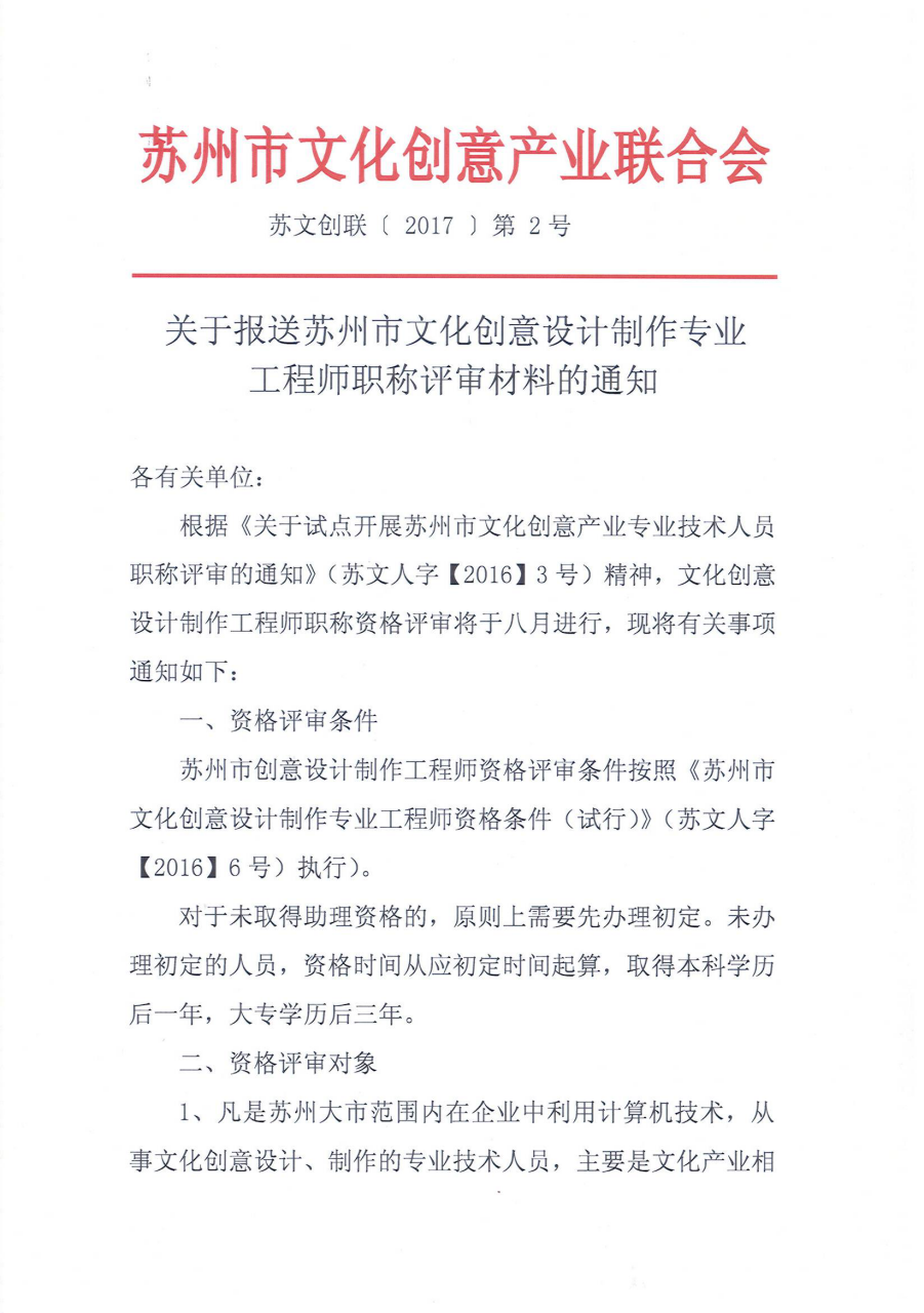 关于报送苏州市文化创意设计制作专业工程师职称评审材料的通知