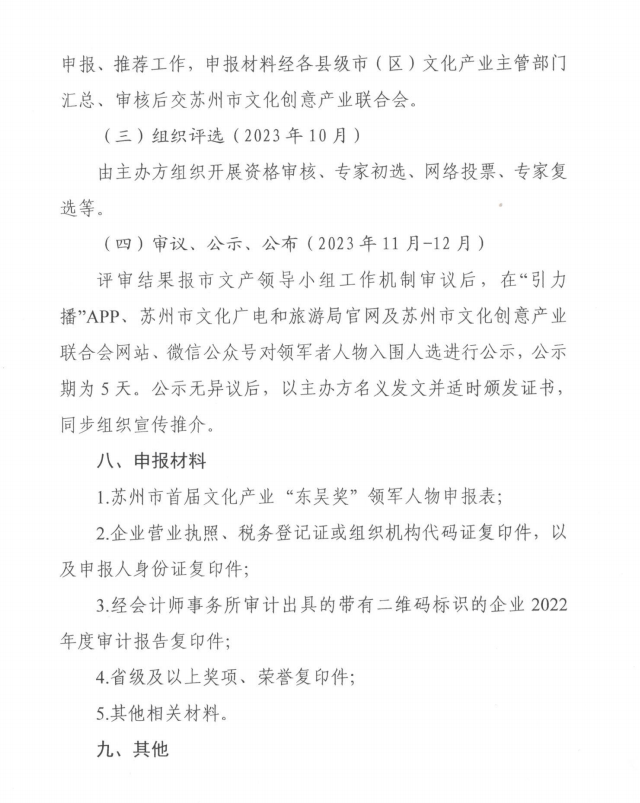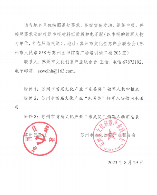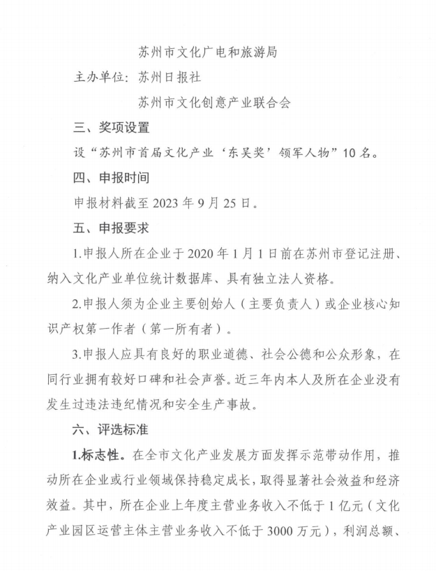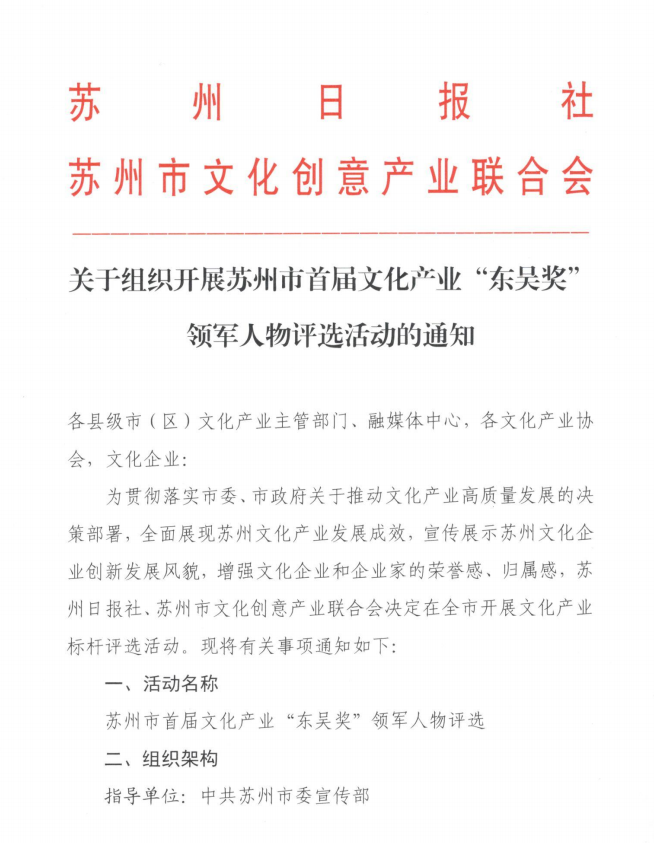 苏州市首届文化产业“东吴奖”领军人物评选活动通知