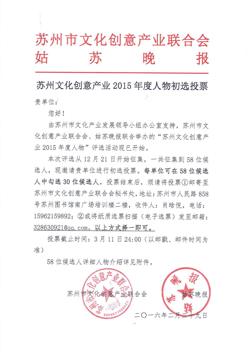 苏州文化创意产业2015年度人物初选正式开始