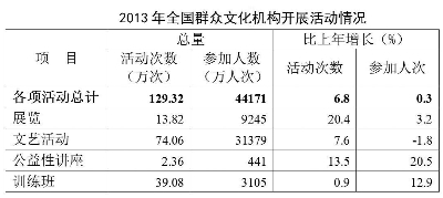 全年全国群众文化机构共组织开展各类活动129.32万场次,比上年增长6.8%;服务人次44171万,增长0.3%。