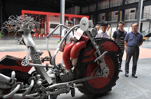 太仓灵狮创意文化产业发展有限公司副总经理吴进礼向汤会长介绍创意展品